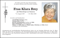 Im Leben warst Du unser Sonnenschein.In unseren Herzen wirst Du weiter strahlen.Frau Klara Breygeb. Wintersberger aus Chamerau* 10. August 1947 _ 16. März 2026In Liebe und Dankbarkeit:Arnold Wintersberger, Sohn Susanne Brey, Tochter Kerstin Aschenbrenner, Tochter mit TobiHans Schönberger, LebensgefährteMarius mit Jella, Jonas mit Madi, Lukas, Christina mit Fabi, Enkelim Namen aller Verwandten Aussegnung mit anschließendem Sterberosenkranz beten wir am heutigen Mittwoch, den 18. März 2026, um 18.30 Uhr in Chamerau. Der Trauergottesdienst findet am Donnerstag, den 19. März 2026, um 14.30 Uhr in der Pfarrkirche Chamerau statt. Anschließend wird unsere Verstorbene im Familienkreis beigesetzt.