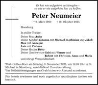 Er hat nie aufgehört zu kämpfen - so wie er nie aufgehört hat zu helfen. Peter Neumeier * 9. März 1960 _ 19. Oktober 2025 Moosburg In stiller Trauer: Deine Frau Anita Deine Kinder: Johanna mit Michael, Korbinian und Jakob Max mit Annegret Luis mit Corinna Deine Mutter Betty Deine Geschwister Gabi mit Werner und Robert mit Christine, Anna und Maria und übrige Verwandtschaft Wort-Gottes-Feier am Montag, 3. November 2025, um 10.00 Uhr in ­St. Michael in Moosburg, anschließend Urnenbestattung. Von Beileidsbezeigungen am Grab bitten wir Abstand zu nehmen. Für bereits erwiesene und noch zugedachte Anteilnahme ­danken wir herzlich.