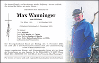 Ein langer Kampf - und doch immer wieder Hoffnung - ist nun zu Ende. Ein letztes Mal hielten wir deine Hände... und nehmen nun Abschied von Max Wanninger vom Gillisberg * 24. März 1955 + 30. Oktober 2025 Gillisberg, Rettenbach, 5. November 2025 Für immer: Deine Siglinde Dein Sohn Martin mit Carina Deine Tochter Sonja mit Martin Deine Enkel Luisa, Liam, Bruno und Ella im Namen aller Verwandten Der Trauergottesdienst findet am Freitag, den 7. November 2025, um 14.00 Uhr in der Pfarrkirche Chamerau statt. Die Urnenbeisetzung ­findet im Familienkreis statt. Anstatt zugedachter Kranz- und Blumenspenden bitten wir im Sinne des Verstorbenen um eine Spende für die PALLIAMO e.V. SAPV Cham, IBAN: DE*** mit dem Vermerk 'Max Wanninger'. Für bereits erwiesene und noch zugedachte Anteilnahme herzlichen Dank.