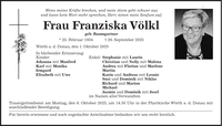 Wenn meine Kräfte brechen, und mein Atem geht schwer aus und kann kein Wort mehr sprechen, Herr, nimm mein Seufzen auf. Frau Franziska Völkl geb. Baumgartner * 25. Februar 1934 + 26. September 2025 Wörth a. d. Donau, den 1. Oktober 2025 In bleibender Erinnerung: Kinder: Enkel: Stephanie mit Laurin Johanna mit Manfred Christian und Nelly mit Malena Karl mit Monika Andrea mit Florian und Marlene Irmgard Martin Elisabeth mit Uwe Karin und Andreas mit Leonie Susi und Dominik mit Niklas Richard und Marion Michael Jasmin und Dominik mit Josef im Namen aller Verwandten Trauergottesdienst am Montag, den 6. Oktober 2025, um 14.30 Uhr in der Pfarrkirche Wörth a. d. Donau mit anschließender Beerdigung. Für bereits erwiesene und noch zugedachte Anteilnahme bedanken wir uns recht herzlich.