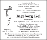 Leuchtende Tage, nicht weinen, dass sie vorüber, lächeln, dass sie gewesen sind. (Konfuzius) In Liebe und Dankbarkeit nehmen wir Abschied von Ingeborg Kei geb. Lämmel * 11. September 1939 + 6. Oktober 2025 In liebevoller Erinnerung: Gabriele Piller, Tochter, mit Ernst Bernhard Wallenta, Enkel Sora Schwalm, Urenkelin im Namen aller Angehörigen Die Trauerfeier mit anschließender Urnenbeisetzung findet am Donnerstag, den 23. Oktober 2025, um 12.00 Uhr im Nordfriedhof Landshut statt.Ergolding, den 18.10.2025