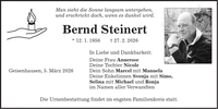Man sieht die Sonne langsam untergehen, und erschrickt doch, wenn es dunkel wird. Bernd Steinert * 12. 1. 1956 + 27. 2. 2026 In Liebe und Dankbarkeit: Deine Frau Annerose Deine Tochter Nicole Geisenhausen, 5. März 2026 Dein Sohn Marcel mit Manuela Deine Enkelinnen Svenja mit Simo, Selina mit Michael und Ronja im Namen aller Verwandten Die Urnenbestattung findet im engsten Familienkreis statt.