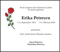 Nach langem und schweren Leiden ist meine geliebte Erika Petrescu * 14. September 1934 _ 13. Februar 2026 gestorben. Gott wollte keine Wunder machen. Savu Petrescu Christina Petrescu