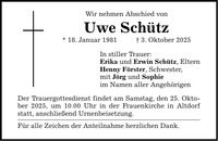 Wir nehmen Abschied von Uwe Schütz * 18. Januar 1981 _ 3. Oktober 2025 In stiller Trauer: Erika und Erwin Schütz, Eltern Henny Förster, Schwester, mit Jörg und Sophie im Namen aller Angehörigen Der Trauergottesdienst findet am Samstag, den 25. Oktober 2025, um 10.00 Uhr in der Frauenkirche in Altdorf statt, anschließend Urnenbeisetzung. Für alle Zeichen der Anteilnahme herzlichen Dank.