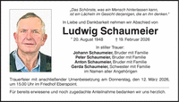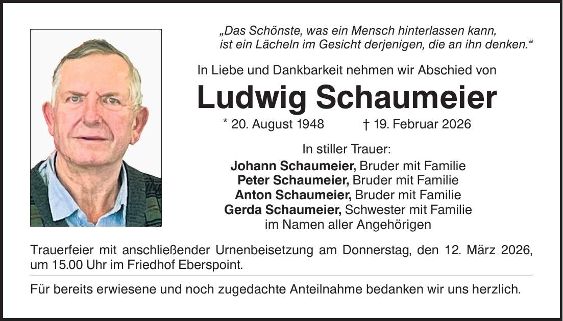 "Das Schönste, was ein Mensch hinterlassen kann, ist ein Lächeln im Gesicht derjenigen, die an ihn denken." In Liebe und Dankbarkeit nehmen wir Abschied von Ludwig Schaumeier * 20. August 1948 _ 19. Februar 2026 In stiller Trauer: Johann Schaumeier, Bruder mit Familie Peter Schaumeier, Bruder mit Familie Anton Schaumeier, Bruder mit Familie Gerda Schaumeier, Schwester mit Familie im Namen aller Angehörigen Trauerfeier mit anschließender Urnenbeisetzung am Donnerstag, den 12. März 2026, um 15.00 Uhr im Friedhof Eberspoint. Für bereits erwiesene und noch zugedachte Anteilnahme bedanken wir uns herzlich.