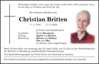 Einschlafen dürfen, wenn man das Leben nicht mehr selbst gestalten kann, ist der Weg zur Freiheit und Trost für alle. Wir nehmen Abschied von Christian Britten * 1. 1. 1941 + 3. 4. 2026 In Liebe und Dankbarkeit: Landshut Deine Rosemarie Eching Sigrid mit Herbert Moosburg Marion mit Helmut Tim und Mia im Namen aller Angehörigen Wort-Gottes-Feier am Samstag, den 25. April 2026, um 10 Uhr in der Friedhofskirche St. Michael in Moosburg, anschließend Urnenbestattung. Von Beileidsbezeigungen am Grab bitten wir Abstand zu nehmen. Für bereits erwiesene und noch zugedachte Anteilnahme danken wir herzlich.