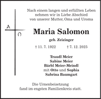 Nach einem langen und erfüllten Leben nehmen wir in Liebe Abschied von unserer Mutter, Oma und Uroma Maria Salomon geb. Zeizinger + 11. 7. 1922 + 7. 12. 2025 Traudl Meier Sabine Meier Bärbl Meier-Meindl mit Otto und Sophia Sabrina Baumgart Die Urnenbeisetzung fand im engsten Familienkreis statt.