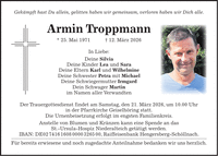 Gekämpft hast Du allein, gelitten haben wir gemeinsam, verloren haben wir Dich alle. Armin Troppmann * 25. Mai 1971 + 12. März 2026 In Liebe: Deine Silvia Deine Kinder Lea und Sara Deine Eltern Karl und Wilhelmine Deine Schwester Petra mit Michael Deine Schwiegermutter Irmgard Dein Schwager Martin im Namen aller Verwandten Der Trauergottesdienst findet am Samstag, den 21. März 2026, um 10.00 Uhr in der Pfarrkirche Geiselhöring statt. Die Urnenbeisetzung erfolgt im engsten Familienkreis. Anstelle von Blumen und Kränzen kann eine Spende an das St.-Ursula-Hospiz Niederalteich getätigt werden. IBAN: DE***, Raiffeisenbank Hengersberg-Schöllnach. Für bereits erwiesene und noch zugedachte Anteilnahme bedanken wir uns herzlich.