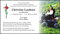 In unserem Leben hast Du Deinen Platz verlassen, in unserem Herzen bist Du immer bei uns. Christine Laubner aus Thenried * 6. Oktober 1967 + 14. Februar 2026 Papa Sepp Mama Herta Requiem am Mittwoch, den 4. März 2026, um 15.00 Uhr in der Pfarrkirche Rimbach, Sterberosenkranz zuvor um 14.30 Uhr. Die Urnenbeisetzung findet im engsten Familienkreis im Trauerwald Schwarzach statt.