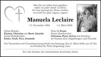 Was Du im Leben hast gegeben, dafür ist jeder Dank zu klein, Du hast gesorgt für Deine Lieben, von früh bis spät, tagaus, tagein. Manuela Leclaire * 2. November 1964 + 2. März 2026 Deine Kinder: Dein Pa Franz Florian, Christina mit Basti, Daniela Deine Geschwister: Deine Enkelkinder: Christian, Petra, Sylvia mit Familien Ennio, Noah, Nico, Dominik im Namen aller Angehörigen und Freunde Die Trauerfeier mit Urnenbestattung findet am Samstag, den 21. März 2026, um 10 Uhr im Friedhof St. Peter, Ergolding, statt. Für alle Zeichen der Anteilnahme herzlichen Dank.