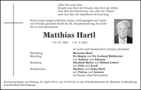 Alles hat seine Zeit. Es gibt eine Zeit der Freude, eine Zeit der Stille, eine Zeit des Schmerzes, eine Zeit der Trauer und eine Zeit der dankbaren Erinnerung. Nach einem langen erfüllten Leben, reich gesegnet mit Liebe und Freude, gestärkt durch die Hl. Krankensalbung, hat Gott ihn zu sich genommen. Matthias Hartl * 18. 10. 1924 + 21. 4. 2015 In Liebe und Dankbarkeit nehmen Abschied: Moosburg Marianne Hartl Marzling Dr. Regina und Dr. Gerhard Mehltretter mit Andreas und Johanna Kienberg Elisabeth Huber und Helmut Lebert mit Felix und Jacob Holzkirchen Matthias und Erika Hartl mit Florian und Antonia im Namen aller Verwandten Eucharistiefeier am Freitag, 24. April 2015, um 10.00 Uhr in der Friedhofskirche St. Michael in Moosburg, anschließend Beerdigung.