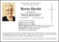 Erinnerungen, die uns berühren, gehen niemals verloren. Berta Hecht geb. Rauscher Trägerin des Verdienstordens der Bundesrepublik Deutschland * 21. April 1943 + 20. Februar 2026 In Liebe und Dankbarkeit: Andreas, Sohn mit Sonja Martina, Tochter mit Xaver Simone, Matthias, Lukas und Jonas, Enkel mit Familien Christa, Willi und Evi, Geschwister mit Familien Xaver Beer, Schwager mit Familie im Namen aller Angehörigen Aussegnung mit Rosenkranz am Donnerstag, den 5. März 2026, um 18.00 Uhr in Rain. Trauergottesdienst am Samstag, den 7. März 2026, um 10.00 Uhr in der Pfarrkirche 'Zur Verklärung Christi' in Rain; anschließend Urnenbeisetzung. Für bereits erwiesene und noch zugedachte Anteilnahme bedanken wir uns sehr herzlich.