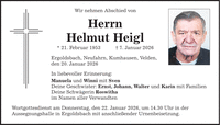 Wir nehmen Abschied von Herrn Helmut Heigl * 21. Februar 1953 _ 7. Januar 2026 Ergoldsbach, Neufahrn, Kumhausen, Velden, den 20. Januar 2026 In liebevoller Erinnerung: Manuela und Winni mit Sven Deine Geschwister: Ernst, Johann, Walter und Karin mit Familien Deine Schwägerin Roswitha im Namen aller Verwandten Wortgottesdienst am Donnerstag, den 22. Januar 2026, um 14.30 Uhr in der Aussegnungshalle in Ergoldsbach mit anschließender Urnenbeisetzung.