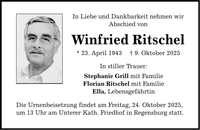 In Liebe und Dankbarkeit nehmen wir Abschied von Winfried Ritschel * 23. April 1943 _ 9. Oktober 2025 In stiller Trauer: Stephanie Grill mit Familie Florian Ritschel mit Familie Ella, Lebensgefährtin Die Urnenbeisetzung findet am Freitag, 24. Oktober 2025, um 13 Uhr am Unterer Kath. Friedhof in Regensburg statt.
