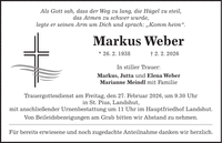 Als Gott sah, dass der Weg zu lang, die Hügel zu steil, das Atmen zu schwer wurde, legte er seinen Arm um Dich und sprach: 'Komm heim'. Markus Weber * 26. 2. 1938 + 2. 2. 2026 In stiller Trauer: Markus, Jutta und Elena Weber Marianne Meindl mit Familie Trauergottesdienst am Freitag, den 27. Februar 2026, um 9.30 Uhr in St. Pius, Landshut, mit anschließender Urnenbestattung um 11 Uhr im Hauptfriedhof Landshut. Von Beileidsbezeigungen am Grab bitten wir Abstand zu nehmen. Für bereits erwiesene und noch zugedachte Anteilnahme danken wir herzlich.