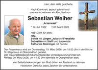 Herr, dein Wille geschehe. Nach Krankheit, jedoch schnell und unerwartet nehmen wir Abschied von Sebastian Weiher 'Arzenwast' * 17. Juli 1952 + 07. März 2026 Hab' Dank für alles: Rita Sylvia mit Jürgen, Julia und Franziska Sebastian mit Steffi und Laurenzia Katharina Steininger mit Familie Der Rosenkranz wird am Donnerstag, 19. März 2026, um 18.00 Uhr in der Kirche St. Stephanus in Oberpindhart gebetet. Der Trauergottesdienst mit anschließender Urnenbeisetzung findet am Freitag, 20. März 2026, um 14.30 Uhr ebenfalls in Oberpindhart statt. Von Beileidsbekundungen am Grab bitten wir Abstand zu nehmen. Herzlichen Dank für jedes Zeichen der Anteilnahme.