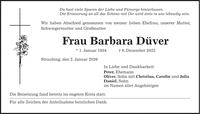 Du hast viele Spuren der Liebe und Fürsorge hinterlassen. Die Erinnerung an all das Schöne mit Dir wird stets in uns lebendig sein. Wir haben Abschied genommen von meiner lieben Ehefrau, unserer Mutter, Schwiegermutter und Großmutter Frau Barbara Düver * 1. Januar 1954 + 6. Dezember 2025 Straubing, den 2. Januar 2026 In Liebe und Dankbarkeit: Peter, Ehemann Oliver, Sohn mit Christina, Carolin und Julia Daniel, Sohn im Namen aller Angehörigen Die Beisetzung fand bereits im engsten Kreis statt. Für alle Zeichen der Anteilnahme herzlichen Dank.