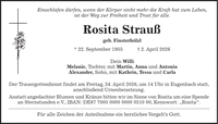 Einschlafen dürfen, wenn der Körper nicht mehr die Kraft hat zum Leben, ist der Weg zur Freiheit und Trost für alle. Rosita Strauß geb. Finsterhölzl * 22. September 1955 + 2. April 2026 Dein Willi Melanie, Tochter, mit Martin, Anna und Antonia Alexander, Sohn, mit Kathrin, Tessa und Carla Der Trauergottesdienst findet am Freitag, 24. April 2026, um 14 Uhr in Eugenbach statt, anschließend Urnenbeisetzung. Anstatt angedachter Blumen und Kränze bitten wir im Sinne von Rosita um eine Spende an Sternstunden e.V., IBAN: DE***, Kennwort: 'Rosita'. Für alle Zeichen der Anteilnahme ein herzliches Vergelt's Gott.