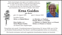 Nach einem langen, bewegten und erfüllten Leben ist unsere liebe Mutter, Oma, Uroma und Schwiegermutter im Alter von 95 Jahren friedlich eingeschlafen. Wir sind traurig über den Abschied, aber auch dankbar und erleichtert, dass sie nun in Frieden ruhen darf. Erna Gaidos geb. Kreter geb. 12. August 1930 gest. 8. Januar 2026 In stiller Trauer: Silvia und Rudolf Rieser mit Kerstin und Norbert, Florian, Meret und Laetitia Peter Gaidos und mit Marion und Simon, Xaver und Franzi, Sylvia Wegner-Gaidos Stefan und Franzi mit Gustav im Namen aller Angehörigen Trauerfeier mit anschl. Urnenbeisetzung am Donnerstag, 22. Januar 2026, um 14 Uhr im Friedhof Niederaichbach. Von Kranz- und Blumenspenden bitten wir abzusehen. Für bereits erwiesene und noch zugedachte Anteilnahme danken wir herzlich.