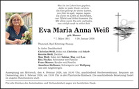 Was Du im Leben hast gegeben, dafür ist jeder Dank zu klein. Du hast gesorgt für Deine Lieben, von früh bis spät, tagaus, tagein. Du warst im Leben so bescheiden, nur Pflicht und Arbeit kanntest Du. Mit allem warst Du stets zufrieden, nun schlafe sanft in stiller Ruh. Eva Maria Anna Weiß geb. Maurer * 7. März 1951 _ 30. Januar 2026 Thenried, Bad Kötzting, Passau In tiefer Dankbarkeit Christian Weiß, Sohn mit Christina und Jakob Kerstin Weiß, Tochter Max Weiß, Sohn mit Sabine, Max und Leo Rita Fischer, Schwester mit Familie Franz Maurer, Bruder mit Familie Anneliese Hofbauer, Schwägerin mit Wolfgang und alle Angehörigen Aussegnung am Mittwoch, den 4. Februar 2026, um 18.00 Uhr, anschließend Sterberosenkranz. Requiem am ­Donnerstag, den 5. Februar 2026, um 15.00 Uhr in der Pfarrkirche Rimbach. Die anschließende Beisetzung findet im engsten Familienkreis statt. Für alle Zeichen der Anteilnahme und Verbundenheit sagen wir herzlichen Dank.