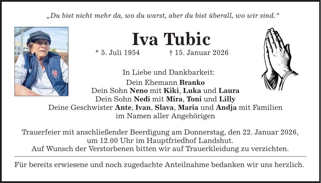 "Du bist nicht mehr da, wo du warst, aber du bist überall, wo wir sind." Iva Tubic * 5. Juli 1954 _ 15. Januar 2026 In Liebe und Dankbarkeit: Dein Ehemann Branko Dein Sohn Neno mit Kiki, Luka und Laura Dein Sohn Nedi mit Mira, Toni und Lilly Deine Geschwister Ante, Ivan, Slava, Maria und Andja mit Familien im Namen aller Angehörigen Trauerfeier mit anschließender Beerdigung am Donnerstag, den 22. Januar 2026, um 12.00 Uhr im Hauptfriedhof Landshut. Auf Wunsch der Verstorbenen bitten wir auf Trauerkleidung zu verzichten. Für bereits erwiesene und noch zugedachte Anteilnahme bedanken wir uns herzlich.