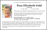 In Liebe und Dankbarkeit nehmen wir Abschied von Frau Elisabeth Gohl geb. Sperl * 31. Mai 1933 + 2. Januar 2026 Schierling, Gau-Algesheim, Regensburg, den 17. Januar 2026 Du hast viele Spuren der Liebe und Fürsorge hinterlassen. Die Erinnerung an all das Schöne wird stets in unserer Erinnerung lebendig sein. Prof. Erich Gohl, Sohn und Eric, Enkel Dr. Peter Gohl, Sohn mit Britta, Malin und Hannah im Namen aller Angehörigen Sterberosenkranz am Freitag, den 23. Januar 2026, um 17.00 Uhr in der Pfarrkirche in Schierling. Trauerfeier am Samstag, den 24. Januar 2026, um 13.00 Uhr in der Aussegnungshalle am Friedhof in Schierling, anschließend Urnenbeisetzung. Für bereits erwiesene und noch zugedachte Anteilnahme bedanken wir uns herzlichst.