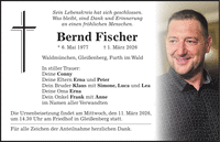 Sein Lebenskreis hat sich geschlossen. Was bleibt, sind Dank und Erinnerung an einen fröhlichen Menschen. Bernd Fischer * 6. Mai 1977 + 1. März 2026 Waldmünchen, Gleißenberg, Furth im Wald In stiller Trauer: Deine Conny Deine Eltern Erna und Peter Dein Bruder Klaus mit Simone, Luca und Lea Deine Oma Erna Dein Onkel Frank mit Anne im Namen aller Verwandten Die Urnenbeisetzung findet am Mittwoch, den 11. März 2026, um 14.30 Uhr am Friedhof in Gleißenberg statt. Für alle Zeichen der Anteilnahme herzlichen Dank.
