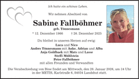 Ich hatte ein schönes Leben. Wir nehmen Abschied von Sabine Fallböhmer geb. Tönnesmann * 12. Dezember 1966 _ 26. Dezember 2025 Du bleibst in unseren Herzen auf ewig: Luca und Nico Andres Tönnesmann mit Anke, Adrian und Alba Anja Goldbaek mit Mats und Lasse Steffi Mühlstein Peter Fallböhmer mit allen Freunden und Verwandten Die Verabschiedung von Bine findet am Mittwoch, den 28. Januar 2026, um 14 Uhr in der METIS, Karlstraße 6, 84034 Landshut statt.