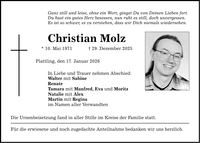 Ganz still und leise, ohne ein Wort, gingst Du von Deinen Lieben fort. Du hast ein gutes Herz besessen, nun ruht es still, doch unvergessen. Es ist so schwer, es zu verstehen, dass wir Dich niemals wiedersehen. Christian Molz * 10. Mai 1971 _ 29. Dezember 2025 Plattling, den 17. Januar 2026 In Liebe und Trauer nehmen Abschied: Walter mit Sabine Renate Tamara mit Manfred, Eva und Moritz Natalie mit Alex Martin mit Regina im Namen aller Verwandten Die Urnenbeisetzung fand in aller Stille im Kreise der Familie statt. Für die erwiesene und noch zugedachte Anteilnahme bedanken wir uns herzlich.