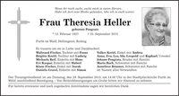 Wenn ihr mich sucht, sucht mich in euren Herzen. Habe ich dort eine Bleibe gefunden, lebe ich in euch weiter. Frau Theresia Heller geborene Pongratz * 12. Februar 1927 + 25. September 2015 Furth im Wald, Hellengerst, Roding Es trauern um sie in Liebe und Dankbarkeit: Waltraud Fischer, Tochter mit Franz Volker Kreitl, Enkel mit Andrea Brigitte Kreitl, Tochter mit Ludwig Anna, Eva, Lea, Ida, Leopold und Raphael, Urenkel Michaela Reif, Enkelin mit Hans Johann Pongratz, Bruder mit Familie Evi Kaspar, Enkelin mit Hubert Maria Bach, Schwester mit Familie Klaus Fischer, Enkel mit Sarah Anneliese Brunner, Schwester mit Familie Daniela Grassl, Enkelin mit Simon im Namen aller Verwandten Der Trauergottesdienst ist am Dienstag, den 29. September 2015, um 14.00 Uhr in der Stadtpfarrkirche Furth im Wald, anschließend Beerdigung. - Von Beileidsbezeigungen am Grabe bitten wir Abstand zu nehmen. Für bereits erwiesene und noch zugedachte Anteilnahme sagen wir herzlichen Dank.