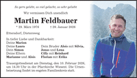 So gern gelebt, so viel gelacht, so sehr geliebt Wir vermissen Dich unendlich Martin Feldbauer * 29. März 1976 _ 29. Januar 2026 Ettersdorf, Dietersweg In tiefer Liebe und Dankbarkeit: Deine Marion Deine Laura Dein Simon Deine Eltern Marianne und Alois Dein Bruder Alois mit Silvia, Jonas und Lena Cilly mit Reinhard Florian mit Erika Trauergottesdienst am Dienstag, den 10. Februar 2026, um 14.30 Uhr in der Pfarrkirche Wiesent. Die Urnenbeisetzung findet im engsten Familienkreis statt.