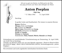 Ich war so gern im Garten, im Feld und in der Flur, nun ging ich heim zum Vater, dem Schöpfer der Natur. Anton Poeplau Dipl.-Ing. * 17. März 1952 _ 2. April 2026 Sarching In großer Liebe und Dankbarkeit. Für immer in unseren Herzen: Renate, Ehefrau Thomas, Sohn mit Corinna Pia, Tochter mit Manuel Marie-Luise, Schwester mit Georg Elisabeth, Schwester mit Joannis Frank mit Sandra Florian mit Stefanie Enkelkinder, Timo, Samuel, Moritz, Hannah und Sonja Gottesdienst mit anschließender Urnenbeisetzung am Donnerstag, 16. April 2026, um 14.00 Uhr in Sarching. Anstelle von Blumen bitten wir um eine Spende zugunsten