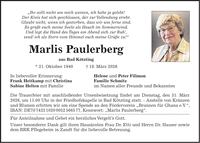 'Ihr sollt nicht um mich weinen, ich habe ja gelebt! Der Kreis hat sich geschlossen, der zur Vollendung strebt. Glaubt nicht, wenn ich gestorben, dass wir uns ferne sind. Es grüßt euch meine Seele als Hauch im Sommerwind. Und legt die Hand des Tages am Abend sich zur Ruh', send' ich als Stern vom Himmel euch meine Grüße zu!' Marlis Paulerberg aus Bad Kötzting * 21. Oktober 1940 + 18. März 2026 In liebevoller Erinnerung: Helene und Peter Filimon Frank Heitkamp mit Christina Familie Schmitz Sabine Helten mit Familie im Namen aller Freunde und Bekannten Die Trauerfeier mit anschließender Urnenbeisetzung findet am Dienstag, den 31. März 2026, um 11.00 Uhr in der Friedhofskapelle in Bad Kötzting statt. - Anstelle von Kränzen und Blumen erbitten wir um eine Spende an den Förderverein 'Brunnen für Ghana e.V.', IBAN: DE***, Kennwort: 'Marlis Paulerberg'. Für Anteilnahme und Gebet ein herzliches Vergelt's Gott. Unser besonderer Dank gilt ihren Hausärzten Frau Dr. Etti und Herrn Dr. Hauser sowie dem BRK Pflegeheim in Zandt für die liebevolle Betreuung.
