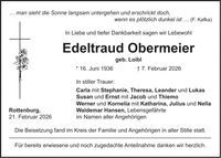 ... man sieht die Sonne langsam untergehen und erschrickt doch, wenn es plötzlich dunkel ist ... (F. Kafka) In Liebe und tiefer Dankbarkeit sagen wir Lebewohl Edeltraud Obermeier geb. Loibl * 16. Juni 1936 + 7. Februar 2026 In stiller Trauer: Carla mit Stephanie, Theresa, Leander und Lukas Susan und Ernst mit Jacob und Thiemo Werner und Kornelia mit Katharina, Julius und Nella Rottenburg, Waldemar Hansen, Lebensgefährte 21. Februar 2026 im Namen aller Angehörigen Die Beisetzung fand im Kreis der Familie und Angehörigen in aller Stille statt. Für bereits erwiesene und noch zugedachte Anteilnahme danken wir herzlich.