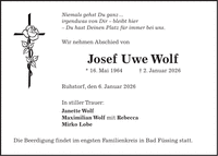 Niemals gehst Du ganz ... irgendwas von Dir - bleibt hier - Du hast Deinen Platz für immer bei uns. Wir nehmen Abschied von Josef Uwe Wolf * 16. Mai 1964 + 2. Januar 2026 Ruhstorf, den 6. Januar 2026 In stiller Trauer: Janette Wolf Maximilian Wolf mit Rebecca Mirko Lobe Die Beerdigung findet im engsten Familienkreis in Bad Füssing statt.