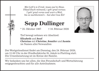 Mei Leb'n is Z'end, muas aus'm Haus. Pfüad Euch mitnand, i geh' grad voraus. I geh' grad voran und wart a Weil, bis es nachkemmt's - hat aber koa Eil! Sepp Dullinger * 25. Oktober 1967 + 16. Februar 2026 Tief bewegt nehmen wir Abschied: Elisabeth und Josef Christian mit Christine, Jennifer und Jasmin im Namen aller Verwandten Der Wortgottesdienst findet am Dienstag, den 24. Februar 2026, um 11.00 Uhr in der Friedhofskirche St. Jakob in Plattling statt. Die Urnenbeisetzung ist im Kreise der Familie. Wir bedanken uns bei allen, die ihm Freundschaft und Wertschätzung entgegenbrachten und für alle Anteilnahmen.