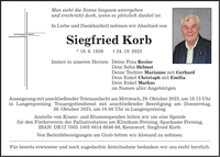 Man sieht die Sonne langsam untergehen und erschrickt doch, wenn es plötzlich dunkel ist. In Liebe und Dankbarkeit nehmen wir Abschied von Siegfried Korb * 16. 6. 1939 + 24. 10. 2025 Immer in unseren Herzen: Deine Frau Rosine Dein Sohn Helmut Deine Tochter Marianne mit Gerhard Dein Enkel Christoph mit Emilia Dein Enkel Markus im Namen aller Angehörigen Aussegnung mit anschließender Totenandacht am Mittwoch, 29. Oktober 2025, um 18.15 Uhr in Langenpreising. Trauergottesdienst mit anschließender Beerdigung am Donnerstag, 30. Oktober 2025, um 10.00 Uhr in Langenpreising. Anstelle von Kranz- und Blumenspenden bitten wir um eine Spende für den Förderverein der Palliativstation am Klinikum Freising, Sparkasse Freising, IBAN: DE***, Kennwort: Siegfried Korb. Von Beileidsbezeigungen am Grab bitten wir Abstand zu nehmen. Für bereits erwiesene und noch zugedachte Anteilnahme bedanken wir uns recht herzlich.