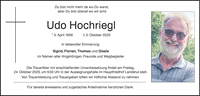 Du bist nicht mehr da wo Du warst, aber Du bist überall wo wir sind. Udo Hochriegl * 3. April 1956 _ 3. Oktober 2025 In liebevoller Erinnerung: Sigrid, Florian, Thomas und Gisela im Namen aller Angehörigen, Freunde und Wegbegleiter Die Trauerfeier mit anschließender Urnenbeisetzung findet am Freitag, 24. Oktober 2025, um 9.00 Uhr in der Aussegnungshalle im Hauptfriedhof Landshut statt. Von Trauerkleidung und Trauergaben bitten wir höflichst Abstand zu nehmen. Für bereits erwiesene und zugedachte Anteilnahme herzlichen Dank.