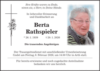 Ihre Kräfte waren zu Ende, nimm sie, o Herr, in Deine Hände. In liebevoller Erinnerung und Dankbarkeit an Berta Rathspieler * 26. 1. 1939 + 20. 1. 2026 Die trauernden Angehörigen Der Trauergottesdienst mit anschließender Urnenbeisetzung findet am Freitag, 6. Februar 2026, um 14.00 Uhr in Arth statt. Für bereits erwiesene und noch zugedachte Anteilnahme bedanken wir uns herzlich.