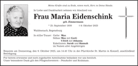 Meine Kräfte sind zu Ende, nimm mich, Herr, in Deine Hände. In Liebe und Dankbarkeit nehmen wir Abschied von Frau Maria Eidenschink geb. Zimmermann * 25. September 1930 + 6. Oktober 2025 Waldmenach, Regensburg In stiller Trauer: Gatte: Max Söhne: Max mit Gerti Ulrich mit Johanna Enkelinnen: Sarah und Hannah im Namen aller Angehörigen Requiem am Donnerstag, den 9. Oktober 2025, um 14.45 Uhr in der Pfarrkirche St. Martin in Konzell, anschließend Beerdigung. Für bereits erwiesene und noch zugedachte Anteilnahme bedanken wir uns herzlich. Unser besonderer Dank gilt den Pflegeschwestern - Penzkofer und Rrahmani.