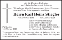 Als die Kraft zu Ende ging, war's kein Sterben, war's Erlösung. Wir nehmen Abschied von meinem lieben Ehemann, unserem Vater, Schwiegervater und Opa Herrn Karl Heinz Stiegler * 19. Februar 1948 + 28. Januar 2026 In liebevoller Erinnerung: Deine Ehefrau Roswitha Dein Sohn Stephan mit Familie Deine Tochter Daniela mit Familie im Namen aller Verwandten Trauergottesdienst am Donnerstag, den 19. Februar 2026, um 14.30 Uhr in Furth. Die Urnenbeisetzung findet im engsten Familienkreis statt.Furth, den 16. Februar 2026