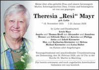 Meine über alles geliebte Frau und unsere herzensgute Mutter, Schwiegermutter, Oma, Uroma und Schwägerin ist von uns gegangen. Theresia 'Resi' Mayr geb. Lehle * 18. November 1935 + 23. Januar 2026 In Liebe und Dankbarkeit: Erich Mayr Angela und Thomas Riedl mit Alexander und Annalena Werner und Elfriede Mayr mit Kerstin und Philipp Anita und Jakob Kiermeier Max und Katharina Kiermeier mit Helena Michael Kiermeier und Luisa Huber im Namen aller Angehörigen Trauergottesdienst mit anschließender Urnenbeisetzung am Donnerstag, den 26. Februar 2026, um 14 Uhr in der Kirche St. Martin in Marzling. Für bereits erwiesene und noch zugedachte Anteilnahme bedanken wir uns herzlich.