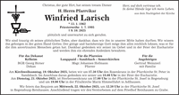 Christus, der gute Hirt, hat seinen treuen Diener H. Herrn Pfarrvikar Winfried Larisch * 13. 1. 1962 Priesterweihe 1. 7. 1995 + 9. 10. 2025 plötzlich und unerwartet zu sich gerufen. Wir sind traurig ob seines plötzlichen Todes, aber dankbar, dass wir ihn in unserer Mitte haben durften. Wir wissen ihn geborgen in der guten Hand Gottes. Der gütige und barmherzige Gott möge ihm alles reichlich lohnen, was er für die ihm anvertrauten Menschen getan hat. Dankbar gedenken wir seiner im Gebet und in der Feier der Eucharistie und werden ihm ein ehrendes Andenken bewahren. Für das Dekanat Für die Pfarreien Für die Kelheim Langquaid - Sandsbach - Semerskirchen Angehörigen BGR Georg Birner Msgr. Johannes Hofmann Gertrud Weinzierl Dekan Pfarrer mit Familie Am Kirchweihsonntag, 19. Oktober 2025, beten wir um 17.30 Uhr den Rosenkranz in der Pfarrkirche St. Peter in Sandsbach. Im Anschluss daran gedenken wir seiner um 18.00 Uhr in der Feier der Eucharistie. Am Dienstag, 21. Oktober 2025, ist Sterberosenkranz um 17.00 Uhr in der Pfarrkirche St. Josef in Regensburg und um 19.00 Uhr in der Filialkirche Mariä Himmelfahrt in Adlhausen. Wir feiern das Requiem am Mittwoch, 22. Oktober 2025, um 12.30 Uhr in der Pfarrkirche St. Josef in Regensburg-Reinhausen. Anschließend tragen wir den Verstorbenen auf dem Friedhof Reinhausen zu Grabe.Herr, auf dich vertraue ich. In deine Hände lege ich mein Leben. aus dem Nachtgebet der Kirche