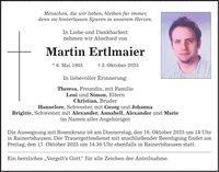 Menschen, die wir lieben, bleiben für immer, denn sie hinterlassen Spuren in unserem Herzen. In Liebe und Dankbarkeit nehmen wir Abschied von Martin Ertlmaier * 6. Mai 1985 + 3. Oktober 2025 In liebevoller Erinnerung: Theresa, Freundin, mit Familie Leni und Simon, Eltern Christian, Bruder Hannelore, Schwester, mit Georg und Johanna Brigitte, Schwester, mit Alexander, Annabell, Alexander und Marie im Namen aller Angehörigen Die Aussegnung mit Rosenkranz ist am Donnerstag, den 16. Oktober 2025 um 18 Uhr in Rainertshausen. Der Trauergottesdienst mit anschließender Beerdigung findet am Freitag, den 17. Oktober 2025 um 14.30 Uhr ebenfalls in Rainertshausen statt. Ein herzliches 'Vergelt's Gott' für alle Zeichen der Anteilnahme.