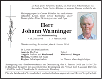 Du hast gelebt für Deine Lieben, all Müh' und Arbeit war für sie. Nun ruhest Du in Gottes Frieden, in unseren Herzen stirbst Du nie. Heimgegangen in Gottes Frieden ist nach einem erfüllten Leben mein lieber Ehemann, unser fürsorglicher Vater, Schwiegervater und Opa Herr Johann Wanninger aus Niederrunding * 19. Juni 1933 + 3. Januar 2026 Niederrunding, Jetzendorf, den 6. Januar 2026 In Liebe und Dankbarkeit: Angela, Ehefrau Enkel: Angela, Tochter mit Ferdinand Martin und Jürgen Monika, Tochter mit Hans Regina, Schwiegertochter im Namen aller Angehörigen Aussegnung und Sterberosenkranz am Donnerstag, den 8. Januar 2026 um 18.30 Uhr in Runding. Requiem mit anschließender Beerdigung am Freitag, den 9. Januar 2026 um 14.30 Uhr in der Pfarrkirche St. Andreas in Runding. Für alle Zeichen der Verbundenheit und Anteilnahme sagen wir von Herzen Vergelt's Gott.