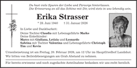 Du hast viele Spuren der Liebe und Fürsorge hinterlassen. Die Erinnerung an all das Schöne mit Dir, wird stets in uns lebendig sein. Erika Strasser * 28. Juni 1940 + 31. Januar 2026 In Liebe und Dankbarkeit: Deine Tochter Claudia mit Lebensgefährte Marko Deine Enkelkinder: Marco mit Giuliana, Letizia und Leonardo Sabrina mit Tochter Valentina und Lebensgefährte Christoph Tim und Kevin Urnenbeisetzung ist am Freitag, 20. Februar 2026, um 12 Uhr im Hauptfriedhof Landshut. Wir bitten von Beileidsbezeigungen am Grab Abstand zu nehmen. Für bereits erwiesene und noch zugedachte Anteilnahme bedanken wir uns recht herzlich.