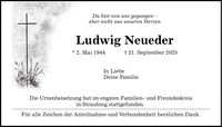 Du bist von uns gegangen - aber nicht aus unseren Herzen Ludwig Neueder * 2. Mai 1944 _ 21. September 2025 In Liebe Deine Familie Die Urnenbeisetzung hat im engsten Familien- und Freundeskreis in Straubing stattgefunden. Für alle Zeichen der Anteilnahme und Verbundenheit herzlichen Dank.