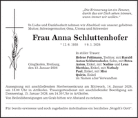 'Die Erinnerung ist ein Fenster, durch das wir Dich sehen können, wann immer wir wollen.' In Liebe und Dankbarkeit nehmen wir Abschied von unserer geliebten Mutter, Schwiegermutter, Oma, Uroma und Schwester Frau Anna Schluttenhofer * 12. 6. 1938 + 9. 1. 2026 In stiller Trauer: Helene Pohlmann, Tochter, mit Harald Anton Schluttenhofer, Sohn, mit Petra Ginglkofen, Freiburg, Anton, Enkel, mit Nadine und Lena den 13. Januar 2026 Matthias, Enkel, mit Nathaly Paul, Enkel, mit Misi Quirin, Enkel im Namen aller Verwandten Aussegnung mit anschließendem Sterberosenkranz am Mittwoch, 14. Januar 2026, um 18.00 Uhr in Artlkofen. Trauergottesdienst mit anschließender Beerdigung am Donnerstag, 15. Januar 2026, um 14.30 Uhr in Artlkofen. Von Beileidsbezeigungen am Grab bitten wir Abstand zu nehmen. Für bereits erwiesene und noch zugedachte Anteilnahme ein herzliches 'Vergelt's Gott'.