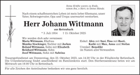 Seine Kräfte waren zu Ende, nimm ihn, o Herr, in Deine Hände. Nach einem schaffensreichen Leben ist mein lieber Ehemann, unser Vater, Schwiegervater, Opa und Uropa unerwartet verstorben. Herr Johann Wittmann aus Rettenbach * 3. Juli 1954 + 15. Oktober 2025 Wir werden dich sehr vermissen: Maria Wittmann, Ehefrau Enkel: Alex mit Susi, Tina mit Basti, Monika Stockinger, Tochter mit Jochen Kathi mit Max, Anna und Stefan Roland Wittmann, Sohn mit Elisabeth Urenkel: Benedikt Reinhard Wittmann, Sohn im Namen aller Verwandten Josef Wittmann, Sohn mit Sabrina Trauergottesdienst am Donnerstag, den 23. Oktober 2025, um 14.30 Uhr in der Filialkirche Rettenbach. Die Urnenbeisetzung findet anschließend im Familienkreis statt. Den Sterberosenkranz beten wir am Mittwoch um 19.00 Uhr in Rettenbach. Für alle Zeichen der Anteilnahme bedanken wir uns ganz herzlich.