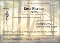 Man sieht die Sonne langsam untergehen und erschrickt dennoch, wenn es plötzlich Nacht ist. Rosa Fischer geb. Adam aus Ramsried * 4. Dezember 1956 _ 28. Oktober 2025 Ein wunderbarer Mensch ist uns vorausgegangen. Aussegnung am Freitag, den 31. Oktober 2025, um 14.45 Uhr in der Friedhofshalle ­Rimbach, anschließend um 15.00 Uhr Sterberosenkranz und um 15.30 Uhr Wortgottesdienst in der Pfarrkirche Rimbach. Die Urnenbeisetzung findet zu einem späteren Zeitpunkt im engsten Familienkreis statt. Anstelle von Blumenspenden bitten wir um eine Zuwendung an PALLIAMO e.V., IBAN DE***, Kennwort: Fischer Rosa. In Liebe und Dankbarkeit Ehemann Andreas Sohn Stefan mit Elvira Tochter Elisabeth mit Andreas Deine Lieblinge Emma und Anna alle Geschwister und Verwandten